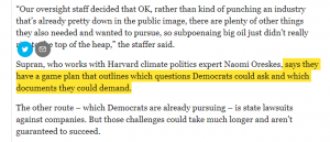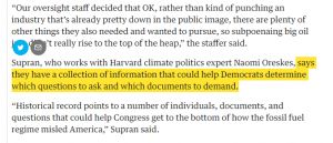 Supran’s plan goes beyond simply calling for a hearing. An archived version of the story in the Guardian explains that Supran “says [he and Oreskes] have a game plan that outlines which questions Democrats could ask and which documents they could demand.”