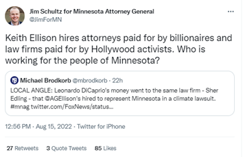 In fact, the story is already putting the spotlight on Minnesota, where Attorney General Keith Ellison hired Sher Edling as outside counsel for the climate lawsuit he filed in 2020. Despite Sher Edling already being paid by DiCaprio and other funders, the firm has a contingency fee agreement with Minnesota that would yield the firm “16.67% of the first $150 million recovered, and 7.5% for any portion greater than $150 million” in a favorable settlement in the case.