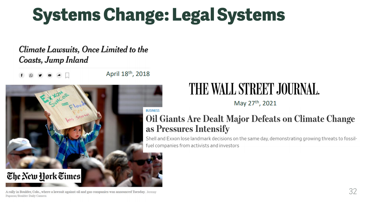 A slideshow accompanying the study session and memo features the below slide, titled “Systems Change: Legal Systems”, with media examples of the lawsuit.