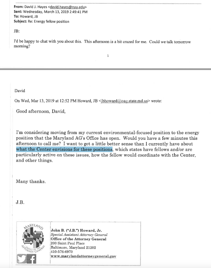 The emails show SAAG John “JB” Howard, who was placed in the Maryland AG’s office through the Michael Bloomberg-funded SEEIC, seeking direction from SEEIC’s director on what his focus should be if he were to move into a potential new role. Looking to change from a focus on environmental issues to an energy position, Howard asked David Hayes, the Director of the SEEIC program, if he could discuss “what the Center envisions for these positions,” as well as “how the fellow would coordinate with the Center.”