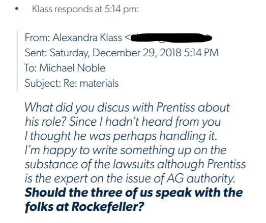 Roughly one month later, in December 2018, Noble asked if Klass wanted “to do a phone call with the lawyers advising the Rockefeller family fund” (sic) and the climate case was off to the metaphorical races.