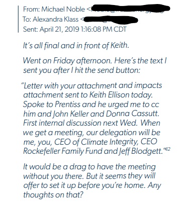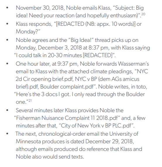 Later, public records requests showed that Noble CCI played an even larger role in orchestrating the lawsuit. Noble approached University of Minnesota Law School professor Alexandra Klass – who had moderated a forum on climate litigation with Ellison in 2019 – about writing a memo that justified such a lawsuit. The non-profit Government Accountability & Oversight documented the coordination in a report: