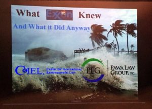 Pawa gave a version of this same presentation at the COP 21 climate conference in Paris in December 2015. One attendee blogged about the presentation, which she said discussed “the prospects of a RICO case against Exxon and other fossil fuel corporations similar to the case brought by the Department of Justice against the tobacco industry.”