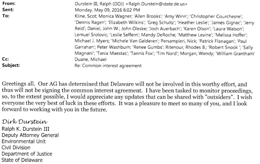 The coalition ultimately fell apart after intense public scrutiny that its work was politically motivated, though not before Delaware suddenly left the group only weeks after then-Attorney General Matt Denn signed a Common Interest Agreement with the other attorneys generals, FOIA’d emails revealed: