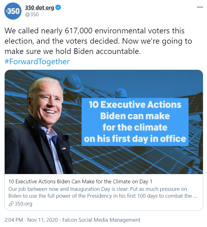 350.org is another major activist group that’s already pushing Biden to use legal tactics against fossil fuel companies. The group tweeted out that “We’re going to make sure we hold Biden accountable” and linked to a list of “10 Executive Actions Biden Can Make for the Climate on Day 1” which included: “Investigate and prosecute fossil fuel polluters.”